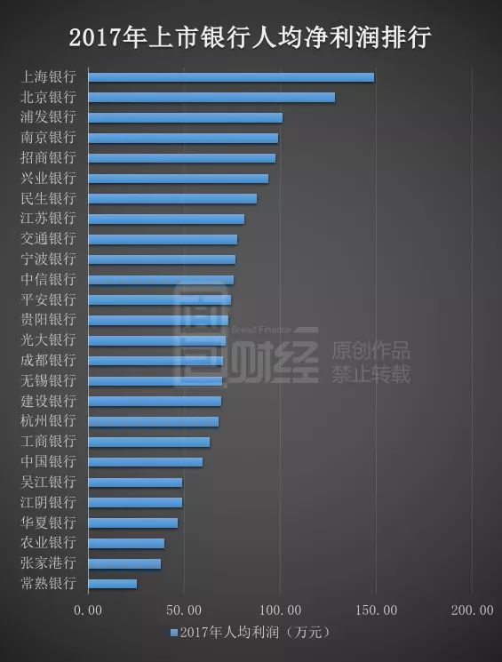 上市銀行的人均績效水平差異在擴大,總部位于經濟發達地區的城商行和股份制銀行人均創利能力更強。上海銀行2017年人均凈利潤148.83萬元,較2016年的137.15萬元,增長了8.52%,蟬聯上市銀行人均創利榜首位。下表為面包財經根據財報數據測算的A股上市銀行人均利潤榜單: