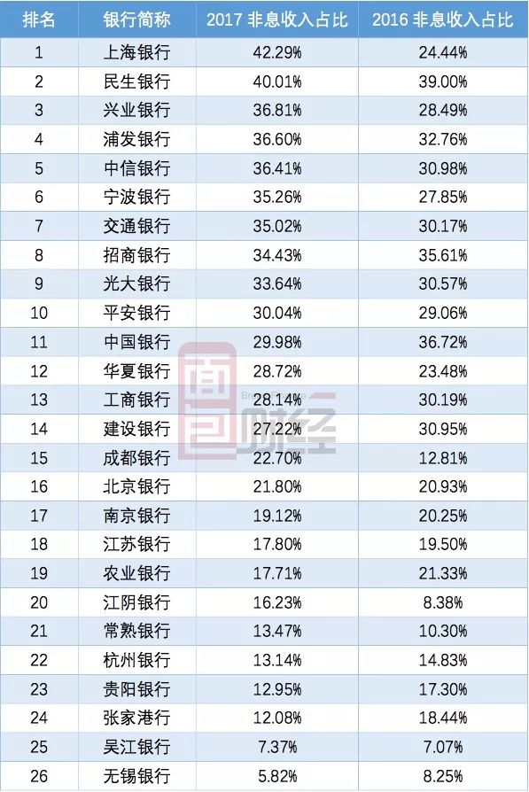 統計數據顯示:四大行的非利息收入占比普遍下降,而城商行非息收入占比普遍上升,股份制銀行則有升有降。