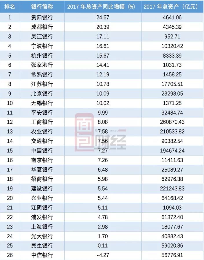 而在2016年,總資產增速在10%以上的上市銀行尚有21家。以下為2017年底各銀行資產增速列表: