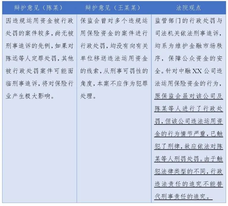 此外,在“胡某某等案”中,辯護(hù)人提出了行政違法性能夠成為阻卻刑事犯罪的理由,即如果被告單位已經(jīng)受到到銀保監(jiān)會的行政處罰就不應(yīng)再受到刑事處罰的觀點(diǎn),而法院認(rèn)為不存在經(jīng)過行政處罰就不能受刑事處罰的相關(guān)規(guī)定,兩者法律類型不同,行政違法責(zé)任的處罰不能替代刑事責(zé)任。