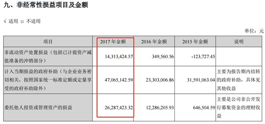 財報顯示:公司利潤大幅飆升主要因政府補助、處置資產及理財收益等非經常性損益大幅增加。2017年,公司政府補助、處置資產及理財收益合計金額約8766.6萬元,占到當期歸母凈利潤的83%。以下為年報披露數據: