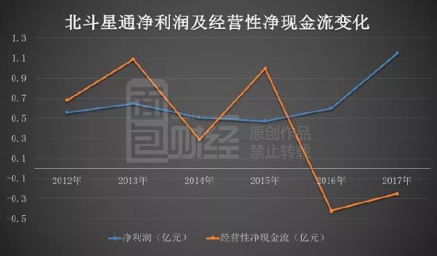 盡管,北斗星通凈利潤大幅飆升,但公司的經營性凈現金流卻已經持續兩年為負:2016年及2017年,公司經營性凈現金流分別為負的約0.42億及約0.25億。