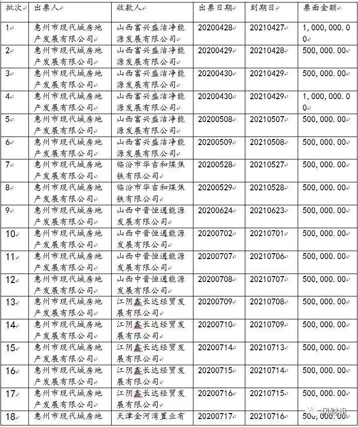 這批票據總規模12億左右,由實地地產的子公司惠州市現代城房地產發展有限公司和天津金河灣置業有限公司簽發,收款人涉及山西、天津、武漢等省市的公司。部分明細如下: