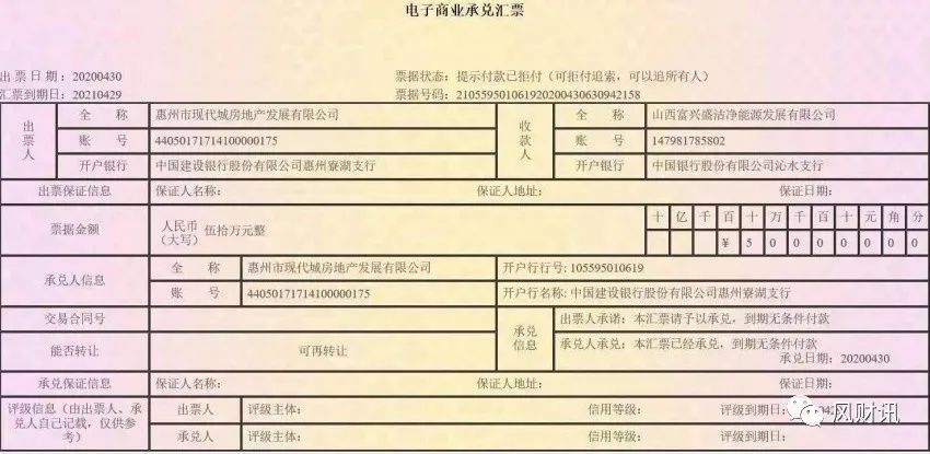 風財訊獲悉一張電子商業承兌匯票顯示,12億融資性票據中,于今年4月27日至30日到期的部分票面為50萬及100萬的最新票據狀態顯示“提示付款已拒付”,出票人為惠州市現代城房地產發展有限公司,收款人名稱均為山西富興盛潔凈能源發展有限公司。