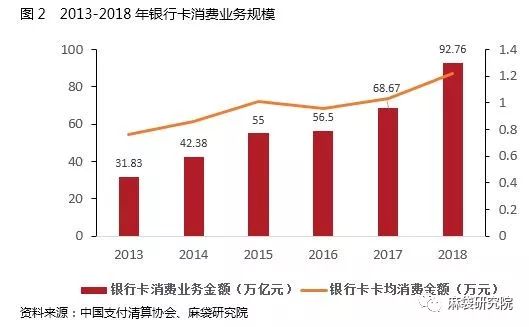 伴隨著發卡量的激增,持卡消費也獲得了快速增長。2013-2018年,銀行卡消費業務金額實現了三倍增長。同時銀行卡卡均消費金額數據顯示,六年間卡均消費從0.76萬元上升至1.22萬元,體現出我國銀行卡發卡數量擴張帶動的消費規模劇增:
