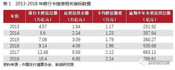 銀行卡數量、銀行卡消費業務的雙增,推動了銀行卡授信總額的攀升。中國支付清算協會數據顯示,六年間銀行卡授信總額從4.57萬億元增長至15.4萬億元,而在貸余額亦實現了跨越式增長,從2013年的1.84萬億元激增至2018年的6.85萬億元,如表1所示: