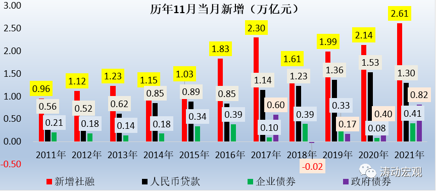 1、受專項債券集中發行以及地產企業發債放松等因素推動。例如,今年10-11月政府債券新增1.43萬億元,同比多增0.54萬億元。今年11月,受11月基數較低(永煤等地方國企違約事件)等因素影響,企業債券同比多增534億元。