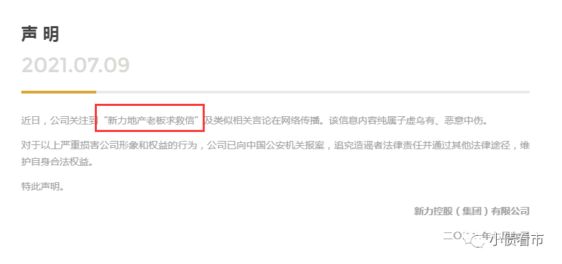 7月9日,新力控股(2103.HK)官網發布一則辟謠聲明稱,近日公司關注到“新力地產老板求救信”及類似相關言論在網絡傳播,該信息內容純屬子虛烏有、惡意中傷。