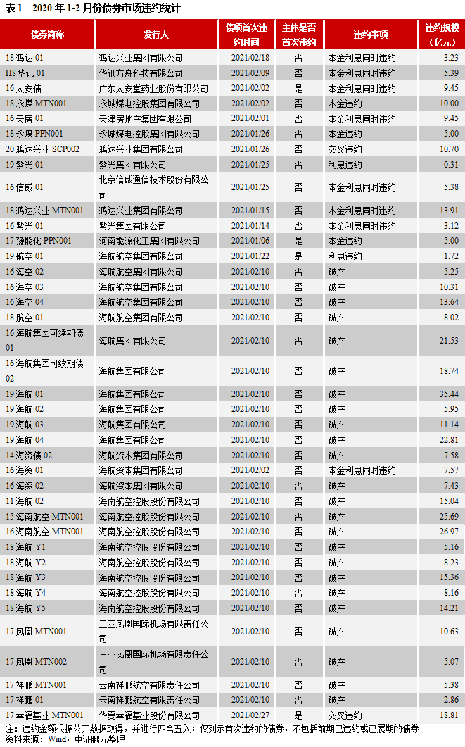 信用風險事件回顧:2021年1-2月份風險事件有53次,涉及19家發行人。其中,首次違約的債券39只,涉及15家發行人,其中4家主體為首次違約。具體看首次違約債券,從違約類型看,除 “20鴻達興業SCP002”和“17幸福基業MTN001”是交叉違約外,其余37只均為實質性違約。從違約事件看,實質性違約的13只債券均為本金利息項違約,24只海航系存續債券因進入破產重整程序而違約。從債券類型看,公司債14只,私募債11只,中期票據8只,企業債3只,定向工具1只,短期融資券1只。從企業性質看,新增的4家主體中,2家違約主體為民營企業,2家為地方國有企業。從上市情況看,新增的4家違約主體中除廣東太安堂藥業股份有限公司和華夏幸福基業股份有限公司外均為非上市公司。從處置方式看,6只債券的發行人與持有人達成延期兌付協議,其中,“19航空01”在展期后,目前進入破產重整,其他債券未公布處置信息。