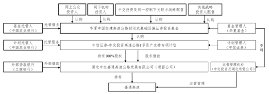 本基金的基金管理人為華夏基金管理有限公司,資產支持證券管理人為中信證券股份有限公司,本基金的托管人為中國農業銀行股份有限公司。基金管理人聘請中交投資有限公司及中交投資湖北運營公司為運營管理機構,提供運營管理服務。上述基礎設施基金的整體架構符合《公開募集基礎設施證券投資基金指引(試行)》的規定。