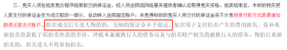 關于這一點,雖然上拍公告說的很清楚,但每年還是有不少買受人出現【違約沒收全部保證金】的情況。