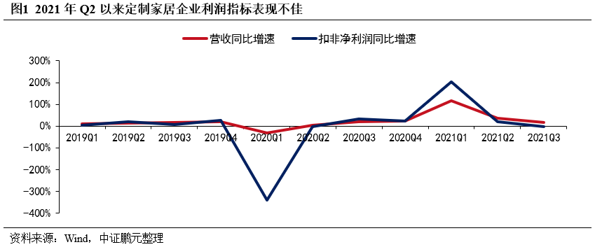 2021年下半年以來,藍光發展、陽光100、恒大集團、花樣年等房企先后爆出流動性風險事件,10月份地產美元債大跌,多個房企主體評級被下調,隨后江山歐派、皮阿諾等定制家居企業被爆持有的恒大商票逾期,定制家居企業一時被負面信息包圍。再觀其財務數據,在地產政策收緊導致行業景氣度下降及原材料漲價等因素影響下,定制家居企業出現了明顯的“增收不增利”特征。