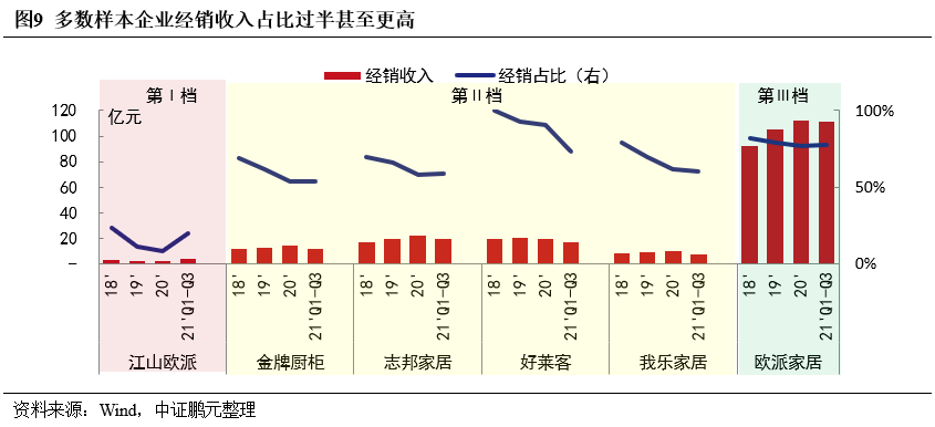 從三年復合增速看,江山歐派以大宗業務為主業,其增速水平仍然不低,金牌廚柜、志邦家居、我樂家居均保持了70%以上的增速,歐派家居增速最低。從2021年前三季度大宗業務增速來看,三檔企業分化更加明顯。歐派家居仍保持增長,江山歐派已出現負增長,第II檔的我樂家居增速也受到重創。金牌廚柜和志邦家居增速受影響較小,主要是金牌廚柜的代理模式占比高,志邦家居調整客戶結構后恒大等高負債客戶合作量大幅下降所致。