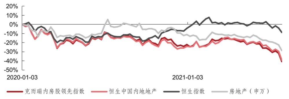 與之相對應(yīng)的是,自去年以來A股、港股地產(chǎn)股整體表現(xiàn)低迷。克而瑞證券監(jiān)測數(shù)據(jù)顯示,2020年1月1日至今,克而瑞內(nèi)房股領(lǐng)先指數(shù)跌幅40.7%,同期恒生中國內(nèi)地地產(chǎn)指數(shù)跌幅39.3%。