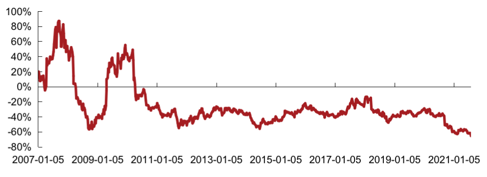備注:相對PE=(克而瑞內(nèi)房股領(lǐng)先指數(shù)成分股整體PE/恒生指數(shù)成分股整體PE-1)*100%