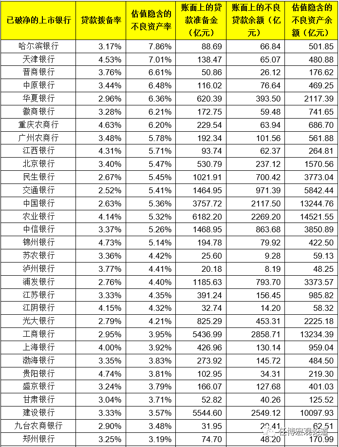 因此對于市凈率已破1的銀行來說,其估值隱含的最大不良資產規模除已計提的貸款損失準備外,還應考慮到資本要素。即