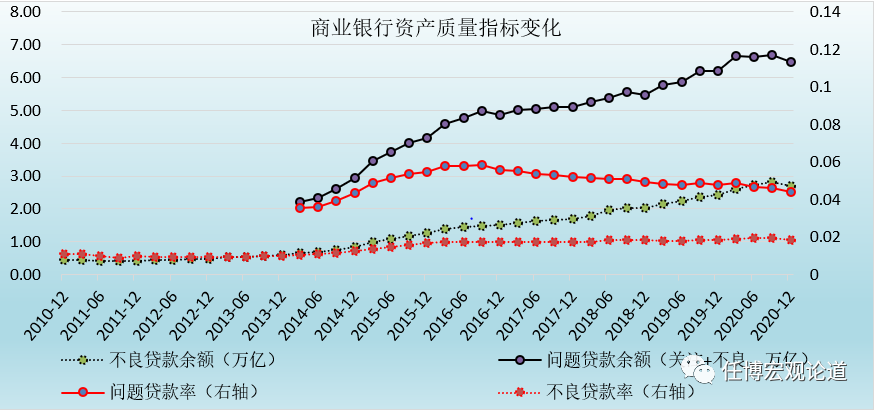 1、2012年以來,我國商業銀行資產質量開始趨于惡化,不良貸款余額增至2.70萬億元、問題貸款余額亦相應增至6.48萬億,不良貸款率提升至1.84%。若不考慮2020年的延期還本付息等政策,則目前我國不良貸款余額和不良貸款率將分別為3萬億和2%以上。