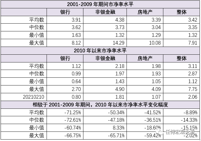 以平均數為例,整體A股市場的市凈率從2001-2009年期間的3.42倍降至2010年以來的3.11倍,下降幅度達8.89%。與之相對應,銀行、非銀金融與房地產在此期間的市凈率下降幅度亦分別達到71.25%、50.34%和41.52%。