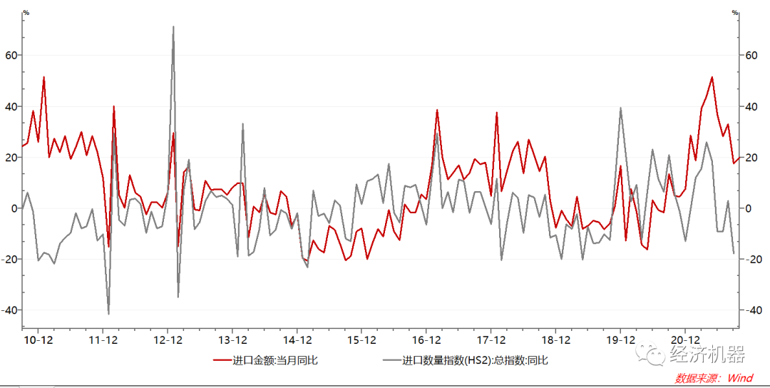 進(jìn)口弱于預(yù)期,部分商品進(jìn)口量減價(jià)升。56.8億美元,環(huán)比上月下降9.7%。同比增長(zhǎng)20.6%,低于