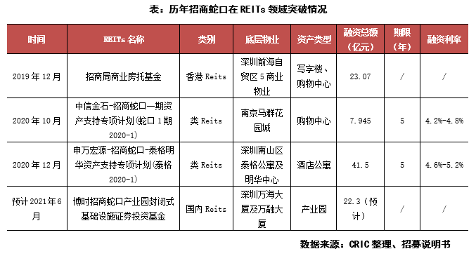 2019年12月,招商蛇口發起招商局商業房托基金(REITs)于港交所掛牌,基金投資組合包括旗下深圳前海自貿區的5個商業物業,資產估值65.17億元。2020年底,招商蛇口還成功發行了“申萬宏源-招商蛇口-泰格明華資產支持專項計劃”,為招商蛇口首單酒店公寓類REITs產品。