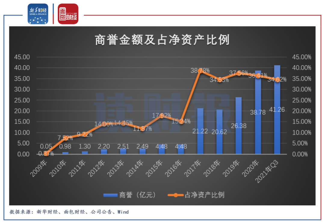 但另一方面,由于持續收并購擴張,愛爾眼科積累了大額商譽。數據顯示,公司的商譽金額由2009年時0.05億元上升至2021年第三季度末41.26億元。自2017年以來,公司商譽金額占凈資產的比例持續高于30%。