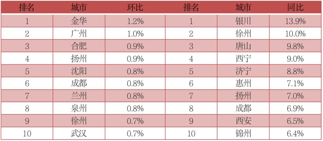 分城市來看,環(huán)比排名中,金華漲幅最快,廣州第二、合肥第三,同比排名中,銀川漲幅最快,徐州第二、唐山第三。