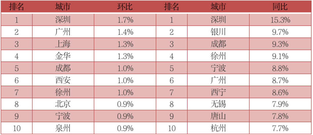 分城市來看,環(huán)比排名中,深圳漲幅最快,廣州第二、上海第三,同比排名中,也是深圳漲幅最快,銀川第二、成都第三。