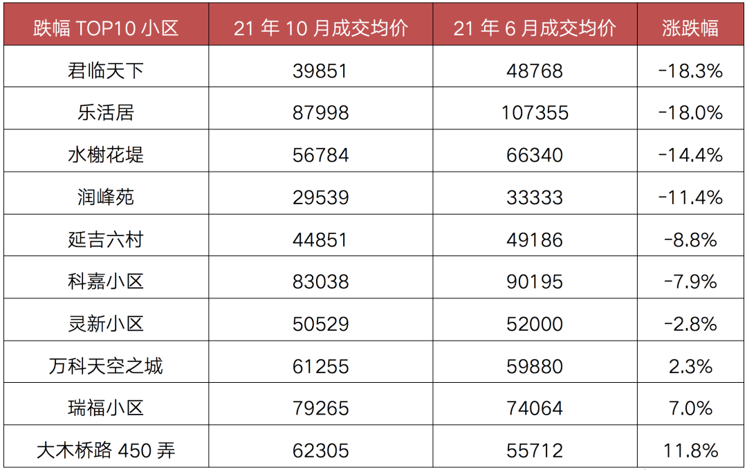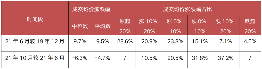 而在指導(dǎo)價(jià)出臺(tái)后,上海二手房?jī)r(jià)格則由漲轉(zhuǎn)跌。剔除零星成交的二手住宅小區(qū),上海2021年10月二手住宅小區(qū)售價(jià)較2021年6月溫和下跌,可比價(jià)格跌幅中位數(shù)、平均數(shù)分別為-6.3%和-4.7%。其中,可比價(jià)格跌幅在10%-20%的二手房小區(qū)占比多達(dá)37.2%,其次為可比價(jià)格跌幅在0%-10%的二手房小區(qū),占比約31.8%,另有31%的二手房小區(qū)可比價(jià)格仍有所上漲。