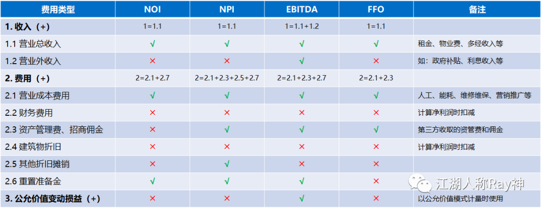 當然,與NOI類似的指標還有EBITDA、NPI、FFO等。國內目前用EBITDA比較多,凱德和一些香港的基金用NPI、REITs拆分股息看FFO。嚴格起來講,這些指標在具體的費用考慮上還是略有差別。但圍繞資產價值的角度來看,NOI更體現了來自資產經營所產生的收益,因而在國際上資管領域的應用更加廣泛。