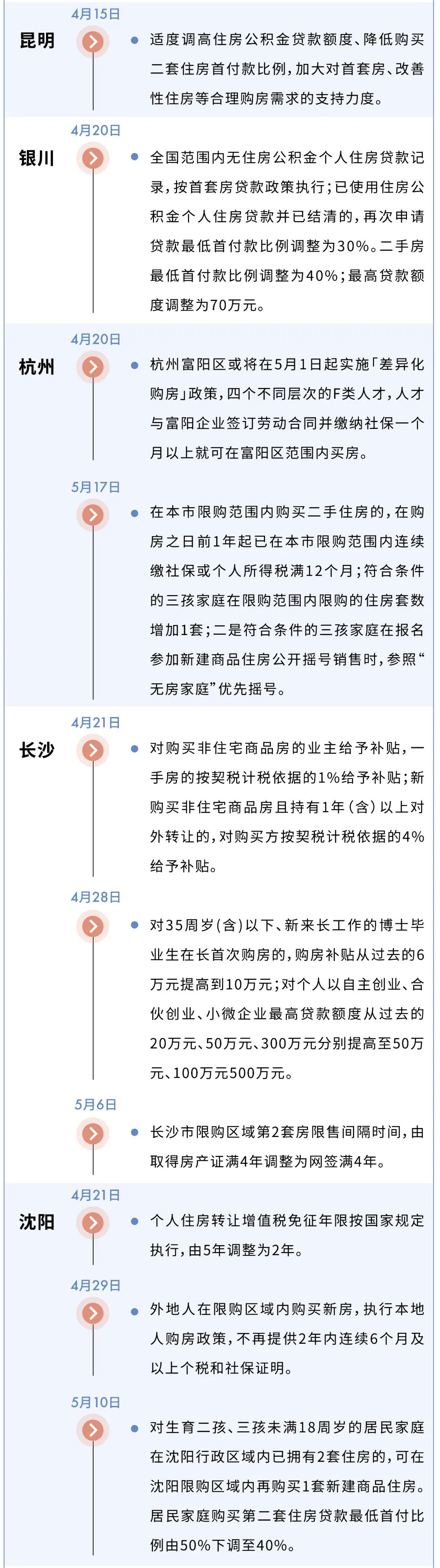 比如杭州5月17日“杭3條”,非戶籍家庭購買二手房社保年限縮短至12個(gè)月,5年內(nèi)落戶不再要求社保。