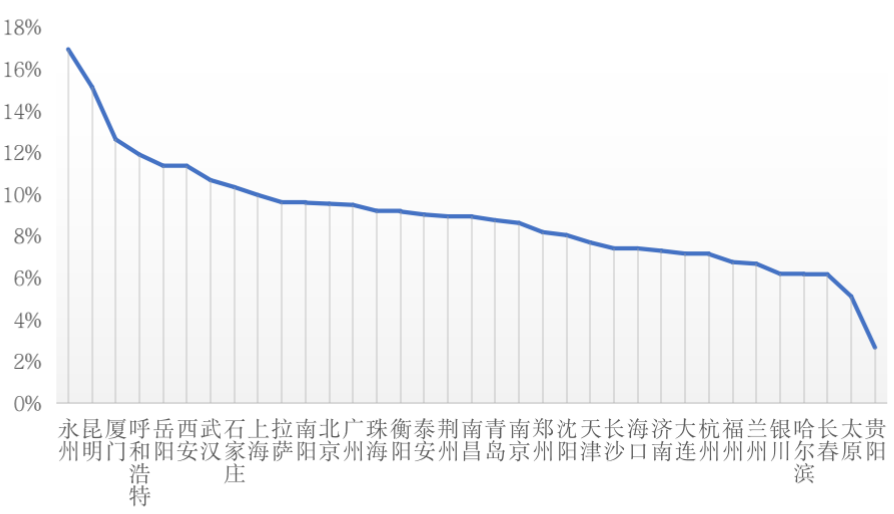 聚焦城市層面來看。在“緩增型”城市中,有多個城市近十年房價復合增長率慢于全國平均水平,其中貴陽的房價漲幅最低,僅有2.6%。