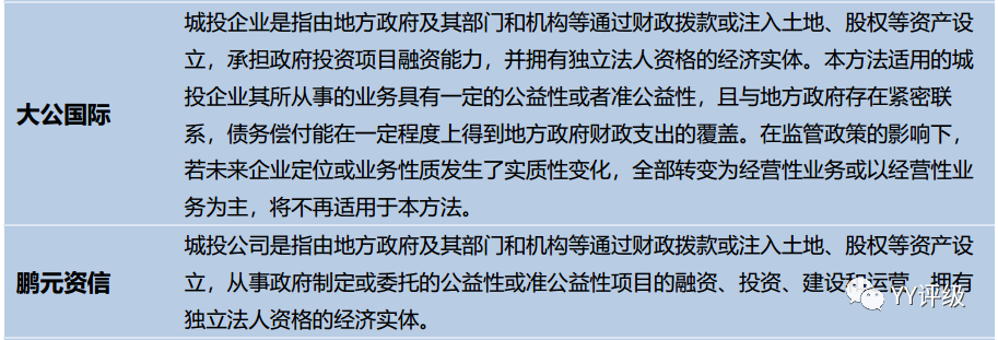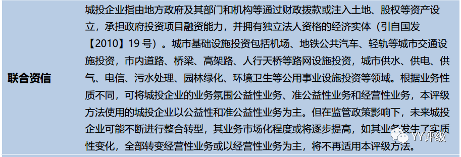 在考慮城投公司起源的基礎上各家評級公司也對各自定義了自己評級方法里的城投公司。基本上,中資評級公司對城投平臺的定義都是根據相關的政府文件來的,但是也有各家評級公司的自身的理解在里面,其中中誠信國際給城投公司命名為基礎設施投融資公司,突出了城投公司的職能;聯合資信和東方金誠細化了城市基礎設施投資的范圍;并且大部分評級公司都考慮了城投公司轉型的問題,強調如果城投公司的定位和業務范圍發生變化,將不適用于城投公司的評級方法。具體各家中資評級公司對城投公司的定義見下表:
