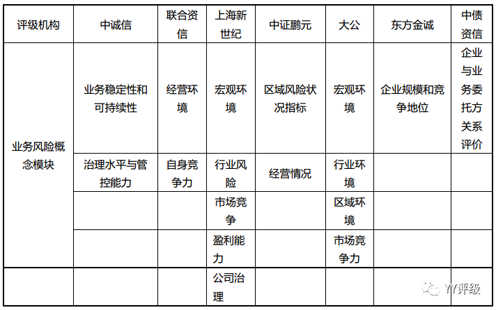 上海新世紀和大公國際還強調了行業風險:上海新世紀對于行業風險要素主要考察行業的經營環境與競爭態勢、增長及盈利趨勢、成本變化和風險事件、融資環境變化與趨勢、政府管制與法律風險等因素,新世紀評級對行業要素進行綜合評估和分析,定期賦予行業風險分檔。大公國際則從政策環境和監管框架兩個方面進行分析。
