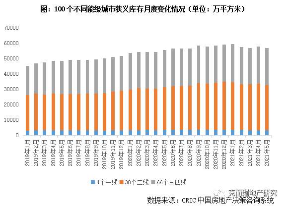 2021年開年以來,狹義庫存除2月顯著跳減之外,一直延續高位震蕩態勢。據CRIC監測數據,2021年5月百城商品住宅庫存量達到了56926萬平方米,環比微降1%,同比增長2%。“金三銀四”銷售旺季已過,5月房企推盤積極性略有回落,環比4月下降三成;成交熱度延續,整體成交量與“銀四”基本持平:一線、三四線城市同環比齊降,需求釋放后略有回落;二線城市市場熱度穩步回升,同環比齊增,顯著好于去年同期。總體來看,成交量略高于供應量,狹義庫存小幅微降。