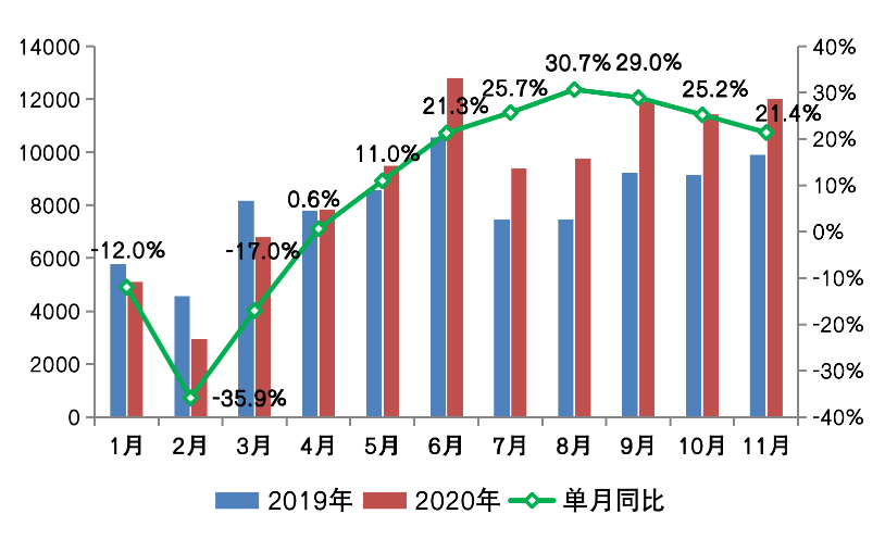 圖:2020年1-11月百強房企單月銷售操盤金額及同比變動(億元)