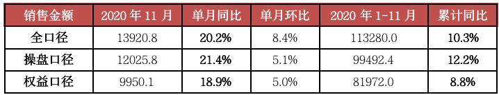 2020年11月,TOP100房企實現銷售操盤金額12025.8億元,單月業績同比增長21.4%,環比較上月小幅上升5.1%。實現全口徑金額13920.8億元,同比增長20.2%,環比增長8.4%,累計來看,前11月TOP100房企實現銷售操盤金額99492.4億元,實現全口徑金額113280.0億元,累計同比分別為12.2%與10.3%。
