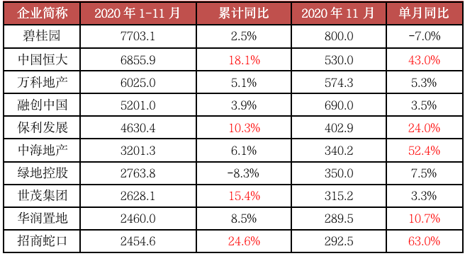 表:2020年1-11月全口徑銷售TOP10房企業績表現(億元)