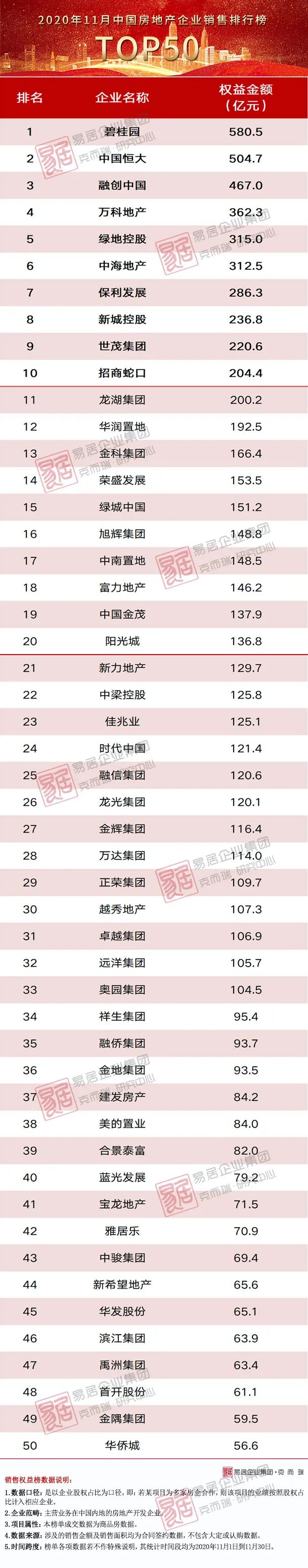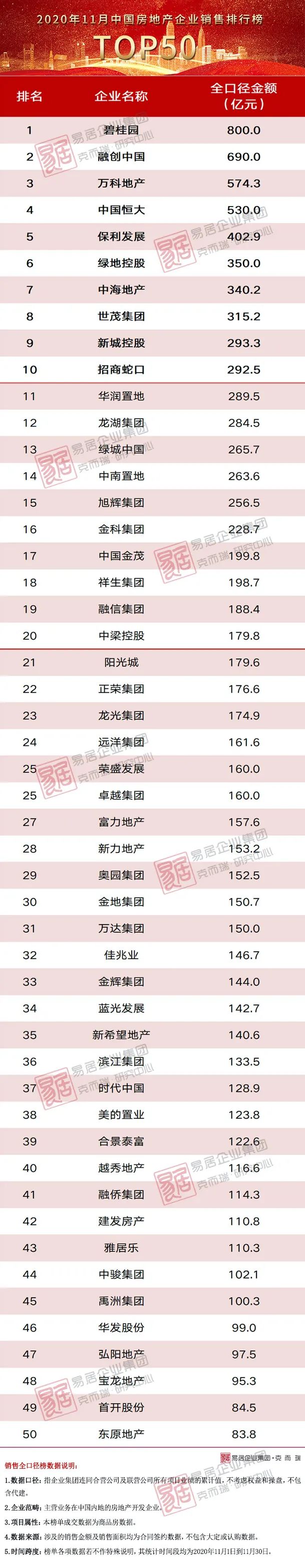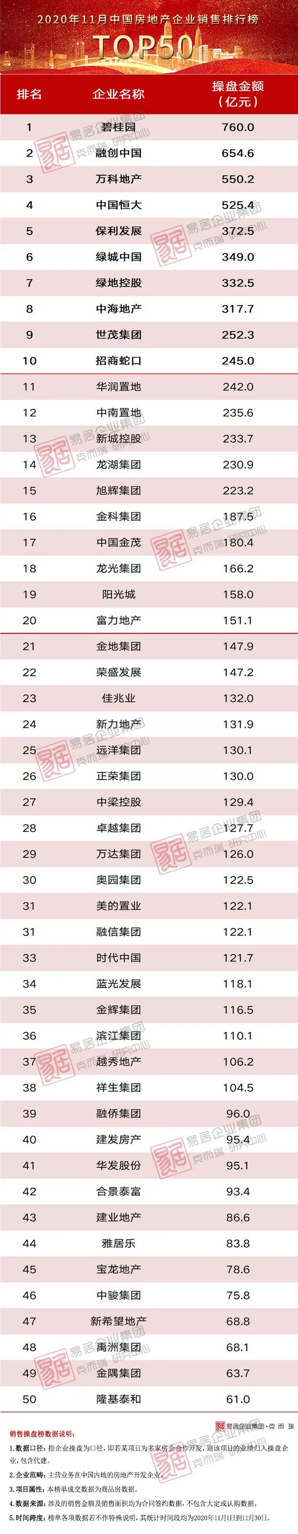 附:2020年11月TOP50房企銷售金額排行榜
