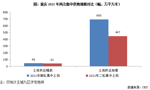 從土地供應規(guī)模上來看,重慶(僅考慮主城九區(qū))二輪集中土拍供應宅地較首輪明顯減少,涉及42宗宅地,總供應建面僅447萬平方米,較首輪總供應規(guī)模減少了36%;分區(qū)域來看,北碚區(qū)、沙坪壩區(qū)和九龍坡區(qū)等環(huán)線外區(qū)域土地供應比較集中,分別有9、8、8宗,南岸區(qū)、渝北區(qū)、巴南區(qū)、江北等區(qū)域供地相對較少,均不足5宗。