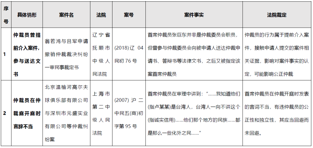 我國《仲裁法》第13條對仲裁員“公道正派”要求可以理解為是對仲裁員公正性的強調。而對不符合公正性要求的情況,《仲裁法》在第34條列舉了一些仲裁員“必須回避”的情形,而通過對我國過往法院判例的檢索,可簡要將必須回避情形的具體場景總結為以下三種,具體如下: