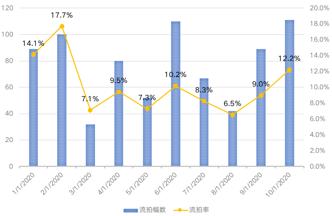 2020年10月,在經歷了年中整體市場復蘇及優質地塊集中供應刺激后,持續收緊的金融環境降低了房企拿地的積極性,加之重點城市近來普通地塊入市明顯增多,土地流拍現象加劇,流拍幅數和流拍率均較9月出現明顯上漲,達111幅,流拍率12.2%