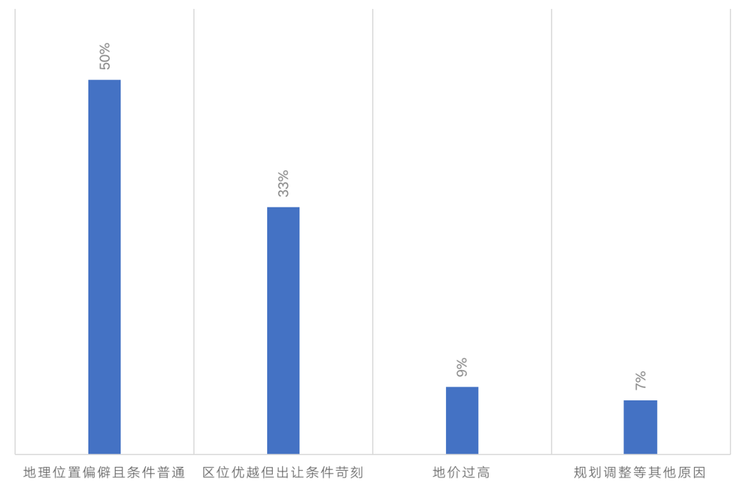 就流拍地塊的具體原因來看,除少數地塊因政府規劃調整、土地出讓條件變更等客觀原因而遭遇撤牌或提前中止出讓外,余下103宗地中大部分地塊多是因位置偏遠且條件一般而流拍,位置好且拿地條件苛刻、地價過高等其他原因占比相對較低。