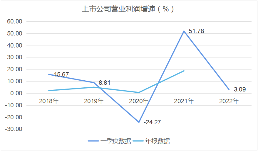 2022年一季度A股公司實現(xiàn)收入164936.38億元,實現(xiàn)凈利潤15157.24億元。A股上市公司一季度收入增速10.97%,與疫情前的增速相當;一季度營業(yè)利潤增速3.09%,低于疫情前的水平。
