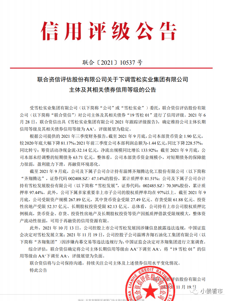 11月23日,聯(lián)合資信公告稱將雪松實(shí)業(yè)集團(tuán)有限公司(以下簡稱“雪松集團(tuán)”)主體和“19雪松01”信用等級由AA+下調(diào)至AA-,評級展望為負(fù)面。