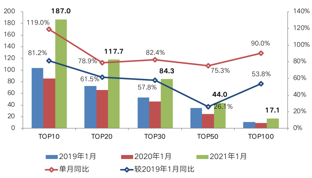 在2020年末熱點(diǎn)城市翹尾行情熱度延續(xù)的帶動(dòng)下,2021年1月,多梯隊(duì)房企銷售業(yè)績門檻值相較去年和前年同期均有不同幅度的提升。TOP100房企銷售操盤金額的入榜門檻為17.1億元,較2020年1月同比增長90.0%,較2019年1月同比增長53.8%。