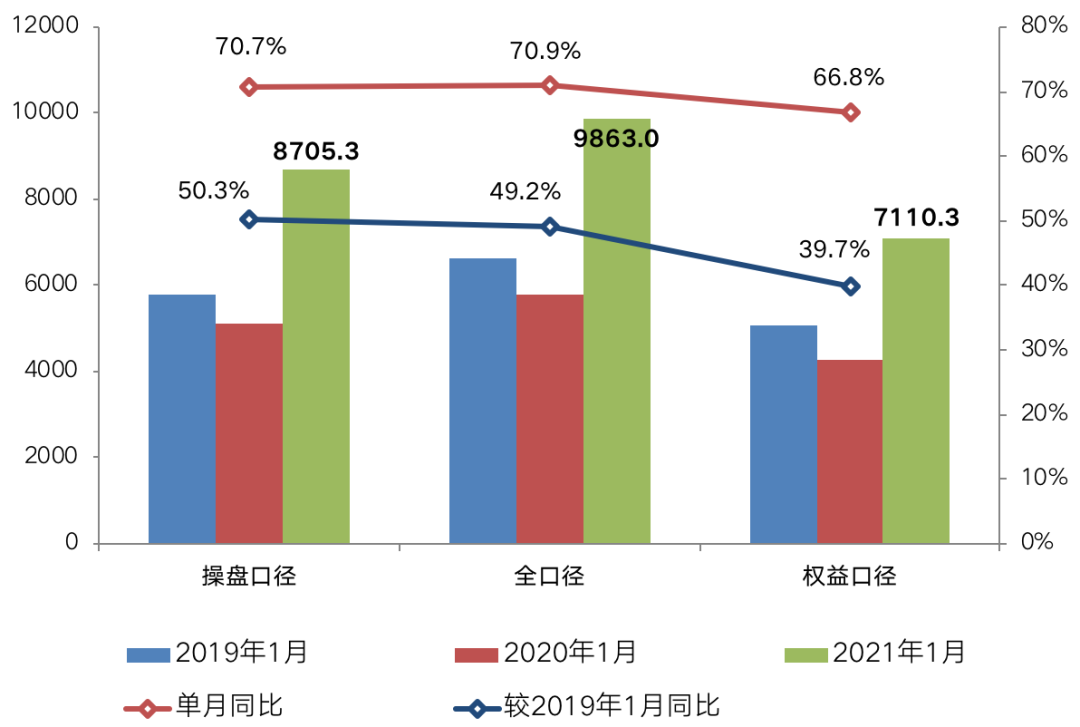 從房企方面來看,2021年1月百強(qiáng)房企單月操盤銷售8705.3億元,同比增長70.7%,這主要是由于去年1月正值春節(jié)假日,1月15日之后基本進(jìn)入春節(jié)前的銷售停滯期,而今年2月才進(jìn)入春節(jié)假期,房企推盤銷售月度節(jié)奏較為完整,再加上去年新冠疫情的爆發(fā),返鄉(xiāng)置業(yè)幾乎停擺,在去年整體成交基數(shù)較低的情況下,今年增長明顯。