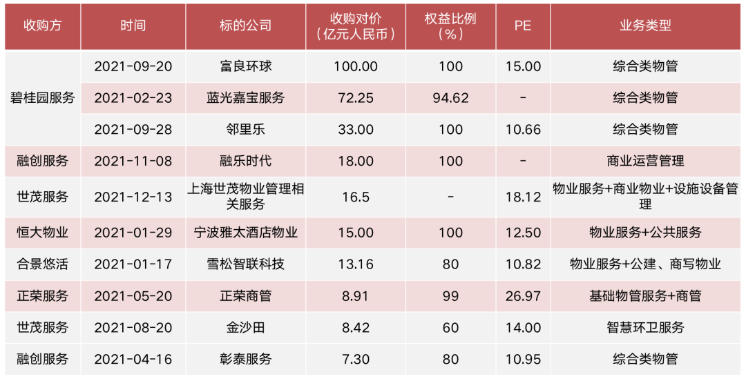 其中,超10億元的并購達七項,前十大并購金額占年度金額超八成。截至2021年底,上市物企發起的并購事項中,有7項交易金額超過10億元,包括:行業首例百億并購案例——碧桂園服務不超過100億元的代價收購富力物業,碧桂園服務最終以現金代價72.25億元收購藍光嘉寶服務94.62%的股權,并以33億元收購鄰里樂等。