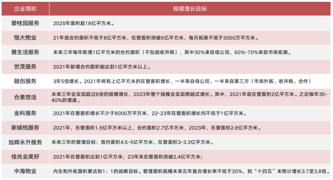 從企業端來看,迫切擴規模的需求,驅動企業發起并購。在年初,多家物企即披露了未來三至五年規模擴張目標,為全年的規模擴張提出指引。如,合景悠活在管規模3年8倍;世茂服務提出規模3年5倍;恒大物業2021年在管面積將破6億平方米,合約面積不低于8億平方米;碧桂園服務則表示2025年規模超18億平方米等。