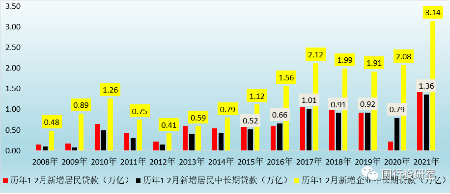 此外還應更關注居民貸款的超預期放量增長。今年1-2月,居民貸款、居民短期貸款和居民中長期貸款分別新增1.41萬億、0.06萬億和1.36萬億,同比分別多增1.19萬億、0.62萬億和0.57萬億,較1月的0.64萬億、0.44萬億和0.20萬億均有明顯擴大。這表明一方面2020年因疫情沖擊受到影響的消費信貸需求有所修復(但絕對增量僅為0.06萬億、數量上并不明顯、消費不足的困境依然比較突出),而經營貸款和按揭抵押貸亦成為今年前兩個月的增長亮點,這某種程度上和近期較為火熱的房地產之間有密切關系。