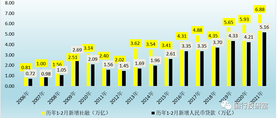 社融指標代表著實體經濟的融資需求,今年1-2月社融累計同比多增0.96萬億,較1月的0.12萬億進一步擴大,表明實體經濟融資需求依然很強勁,經濟仍在持續修復,基于此大致判斷今年一季度經濟增速預計會達到15%以上。